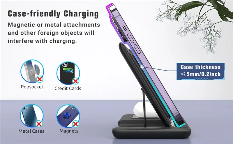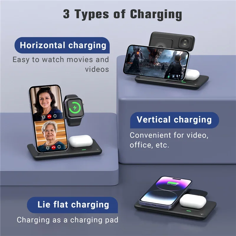 3 IN 1 WIRELESS CHARGER STAND: wireless charging station can charge your for apple iwatch 2/3/4/5/6/SE/7/8/Ultra 【CAN NOT for Samsung Watch】 , Airpods Pro/2/3/Pro2, phones at the same time, such as for iPhone 17/17Pro/17 pro max/ iPhone 16/16Pro/16 pro max/iPhone 15/15Pro/15 pro max/14/14 Plus/14 Pro/14 Pro Max/13/13 Pro/13 Pro Max/13 Mini/12/12 Pro/12 Pro Max/12 Mini/11/11 Pro/11 Pro Max/SE/8/8 plus, Samsung Galaxy S25/S24/S23/S22/S21/S20/S10 series and all certified devices. Say goodbye to the messy cords, makes your desk and nightstand neatly and organized. For better charging experience, please use QC 3.0 power adapter(Not included QC 3.0 Adapter).